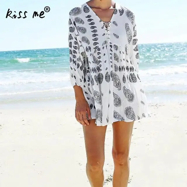 Ailunsnika Casual Long Sleeve Beach Dress Cover Ups for Women Swimwear Kaftan Bathing Suit Cover up Dresses Navy Drawstring waist on this breezy cover ups shape your figure perfectly. NFASHIONSO Women's Sexy Cotton Deep V Neck Swimsuit Cover up/Beachwear Dress. by NFASHIONSO. $13.99 - $16 style sheer beach cover up with V-neck and long