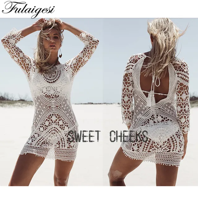 23 wrz 2018- Women Hollow Out Beach Bikini Cover Up Swimsuit Bathing Swimwear Dress USA Stock. Stylish Lady Sexy Women's Halter Backless Hollow Out Swimwear One Piece Tunic Beach Swimsuit Bathing Suit Material: Nylon, 2 Colors for your choice: Black, White, Collar: Halter, "Sheer Lace long sleeve crop with #white bikini. Boho beach